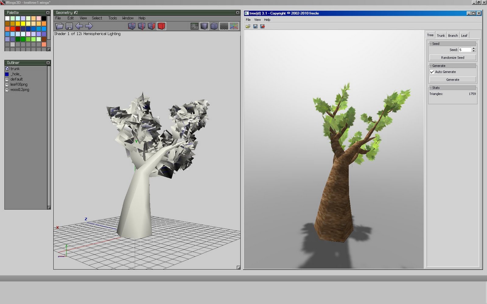 The program is called tree[d]. I tried it out awhile ago, and walked away annoyed, because it was nice but it only exported B3D and X formats, both of which are distinctly non-portable unless you can afford Polytrans or like being frustrated with the free tools.