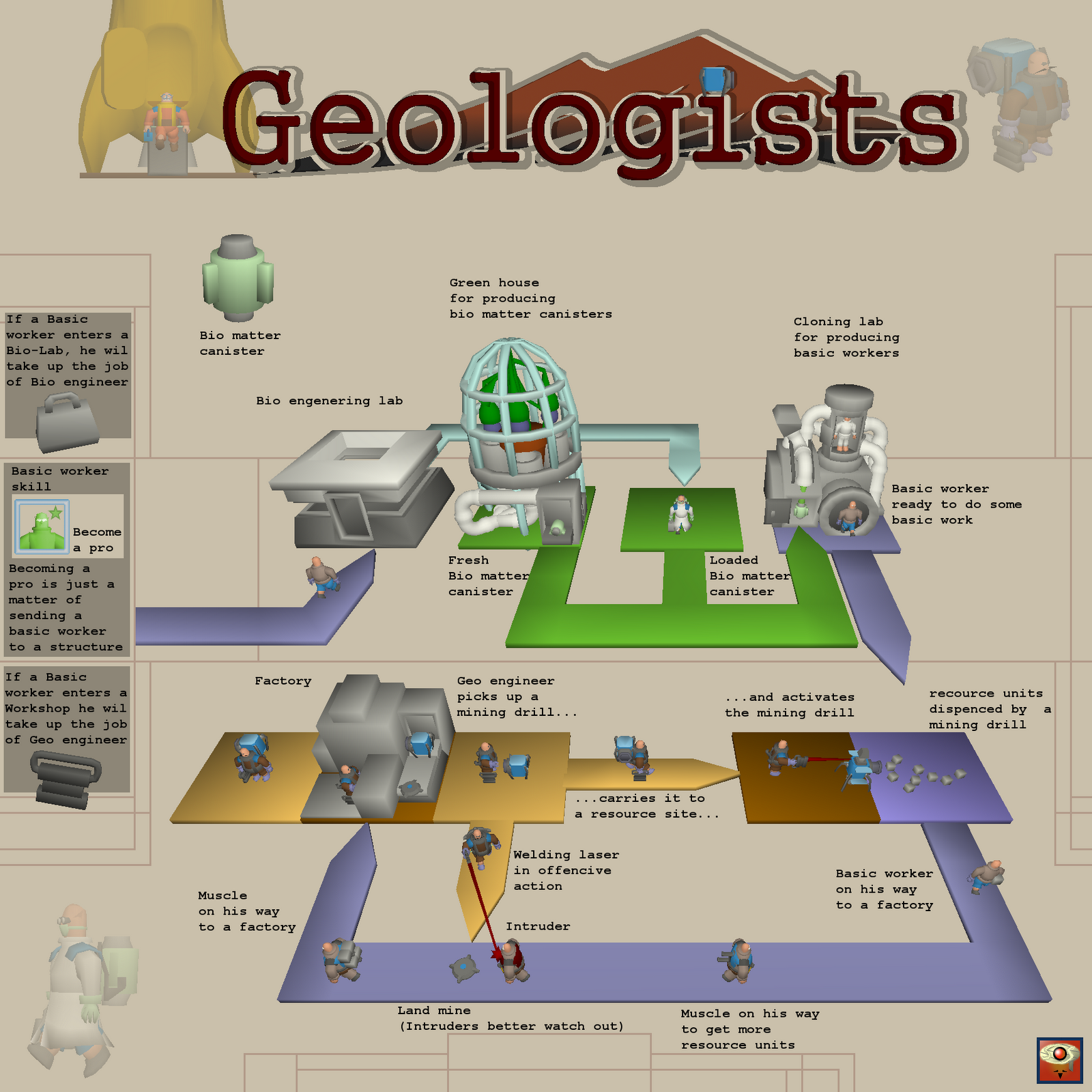 For example you may have 10 worker units harvesting a resource and you want them to produce a constant stream of units. Their order queue would consist of a clone command which has two outwards arrows representing the output units. One outwards arrow would be dragged to point back to the clone command while the other arrow would point to a "morph to combat unit" command followed by a move command to what is a effectively a rally point.